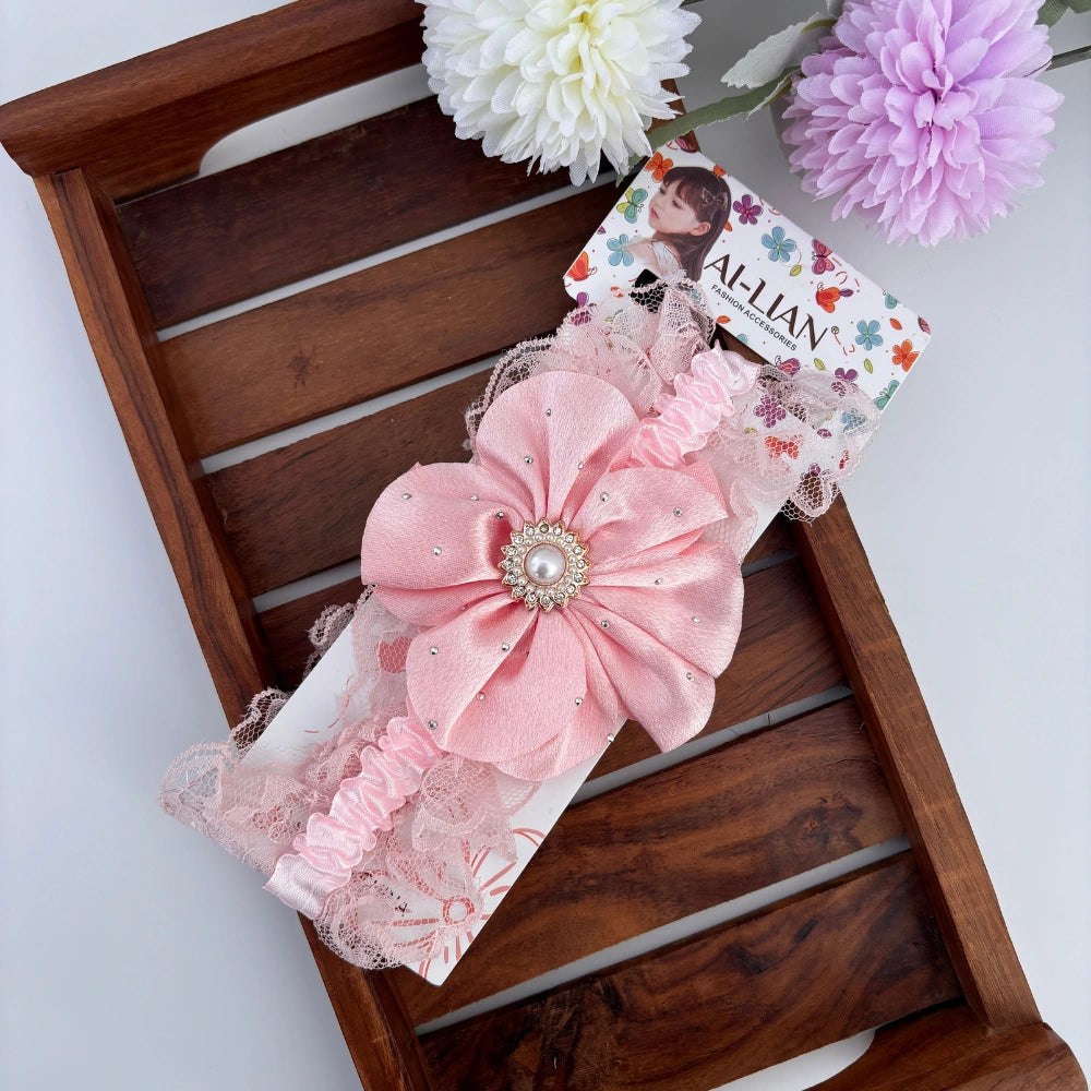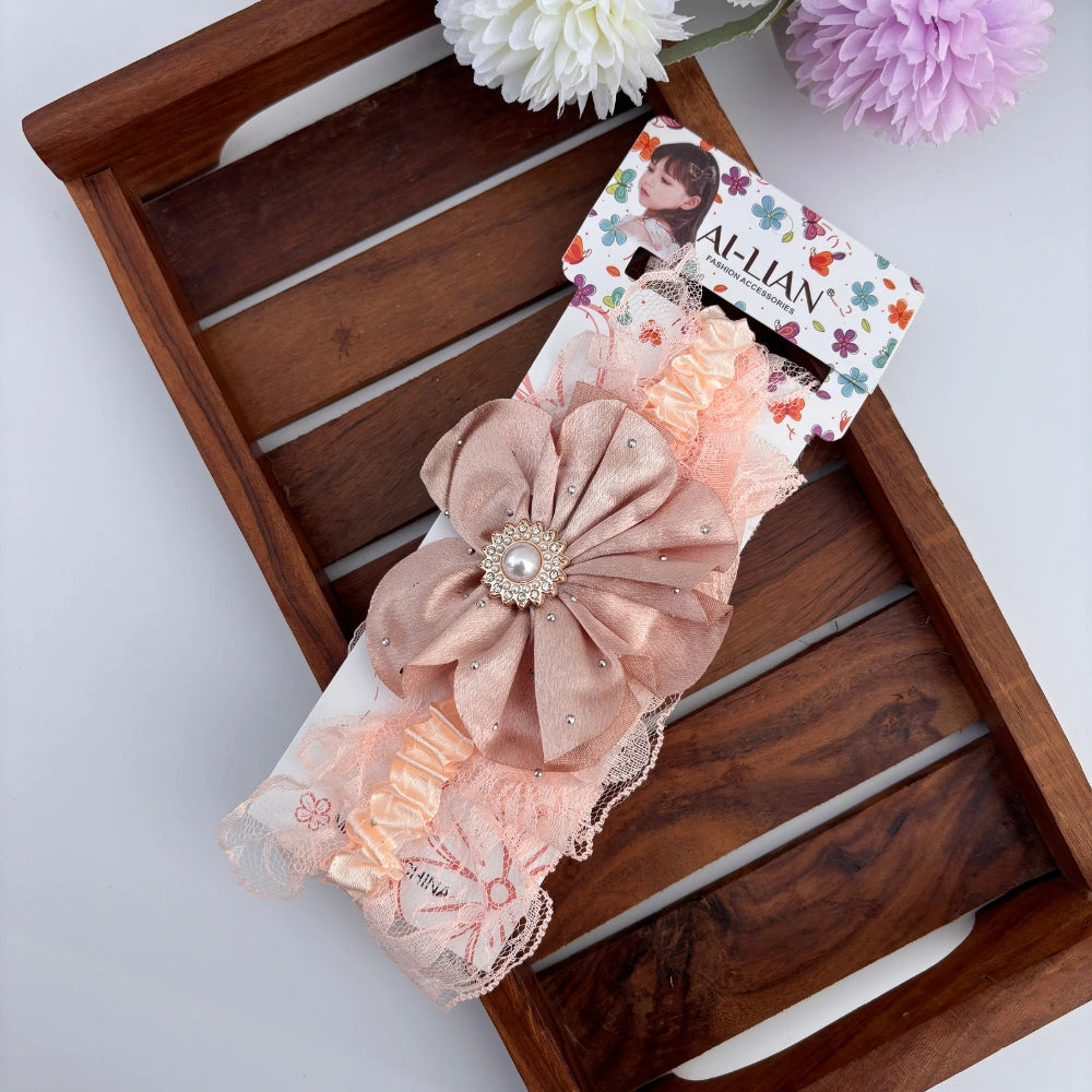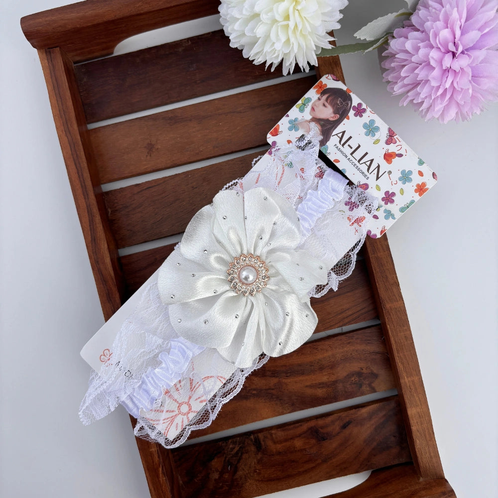 “Elegance in every detail—this lace headband features a delicate flower with a pearl center, designed to add a graceful touch to your newborn’s precious look.”