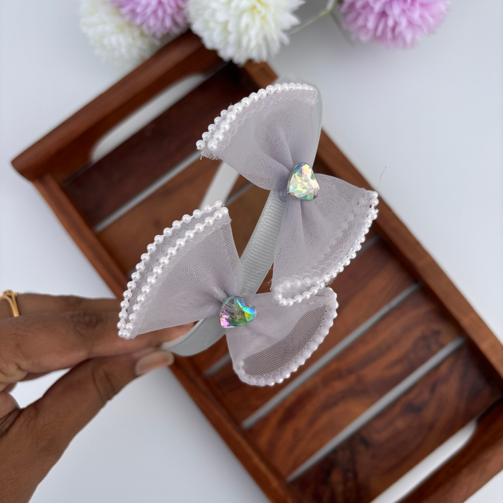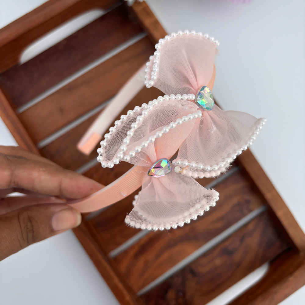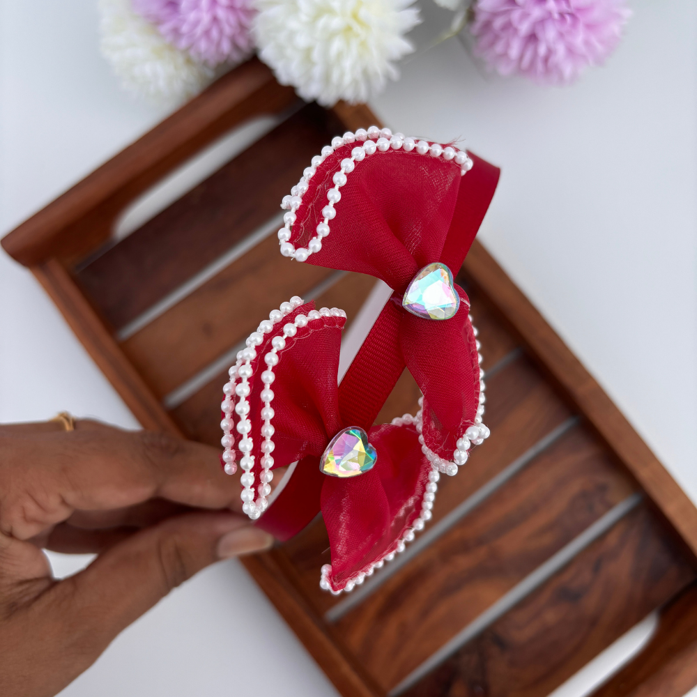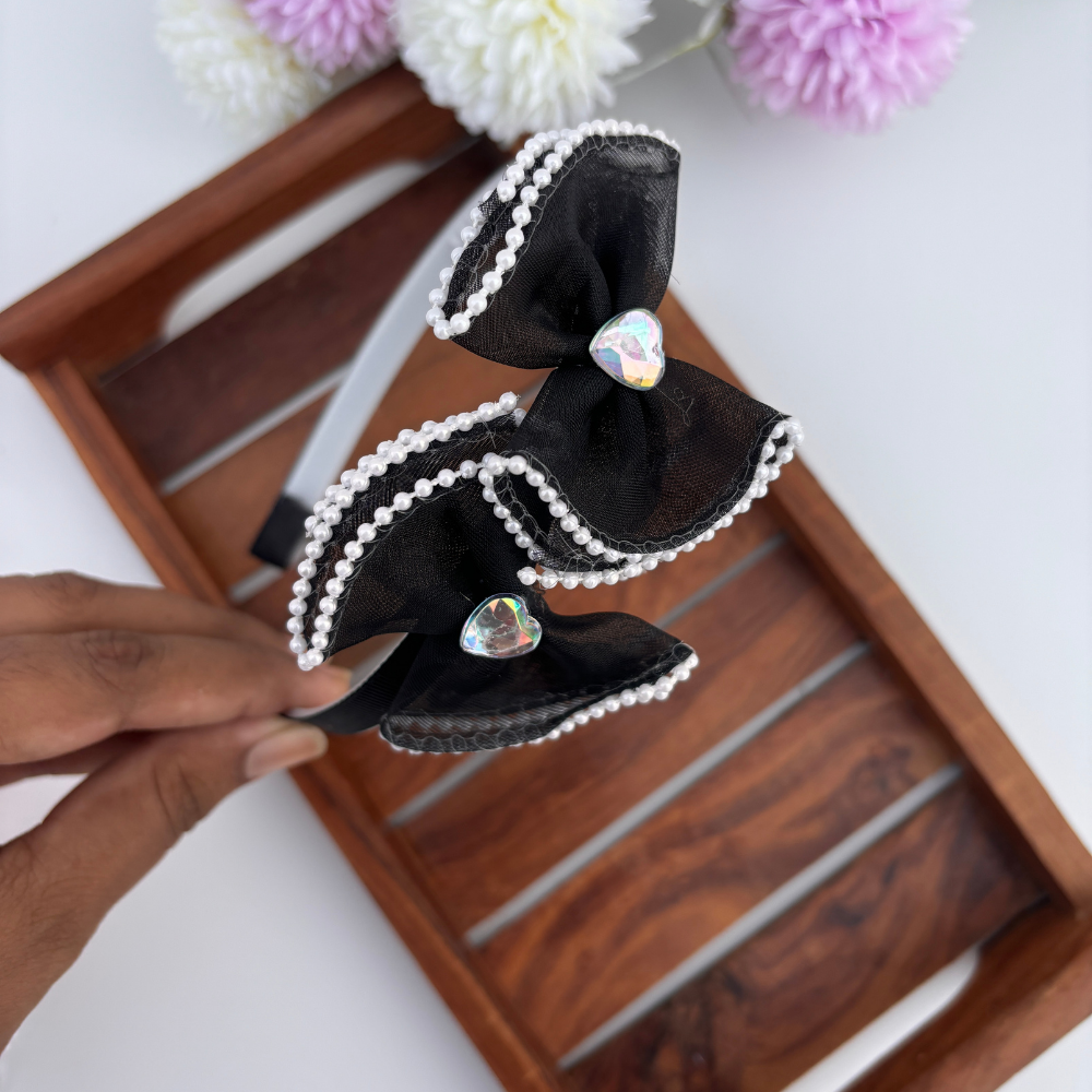 Charming and elegant, these headbands feature oversized bows with pearl-edged trim and a sparkling heart gem at the center. A perfect blend of grace and sparkle for parties, photoshoots, or festive outfits!