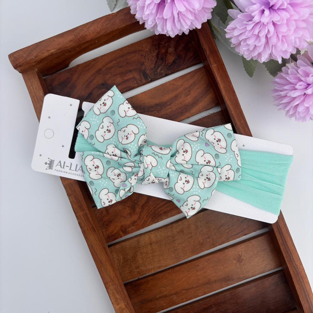 Soft and stretchy headband adorned with a playful puppy print and delicate bow, perfect for keeping your newborn comfy and cute all day long.