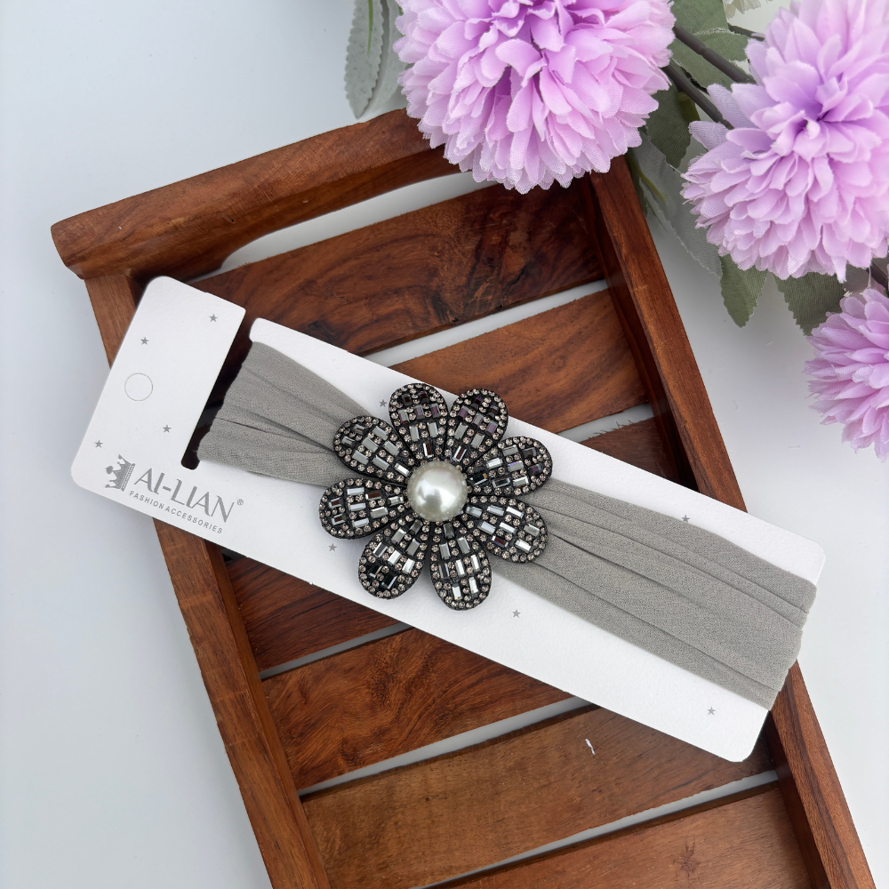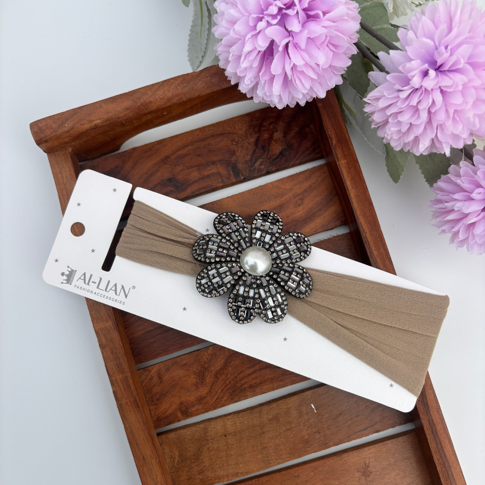 Add elegance to your baby’s outfit with this dark brown headband, highlighted by a jeweled flower and a lustrous pearl center — perfect for special occasions.